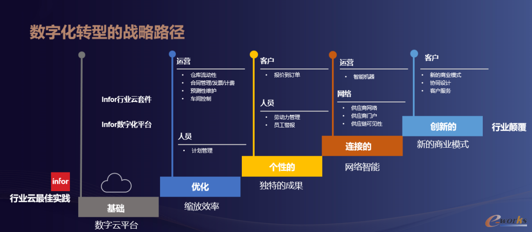 尽管数字化转型有迹可循,每家企业还是有自身节奏。谢晓蓓认为基础的步骤就是搭建核心业务的数字云平台,但务必要部署在具备行业属性、满足行业需求、搭载行业思维的数字化平台上。基于行业化云平台,Infor帮助客户在进一步流程运营和组织协同等领域提升效率;下一阶段,可以实现高度个性化的业务场景,此阶段云平台上的配置工具必不可少;再一步,帮助企业实现上下游生态业务数据的连接及管理,外部数据将在此被打通,形成完整的商业智能网络;最后阶段,Infor将帮助客户更加轻松地实现商业模式创新,基于人工智能平台和技术,实现更高维度的行业颠覆。