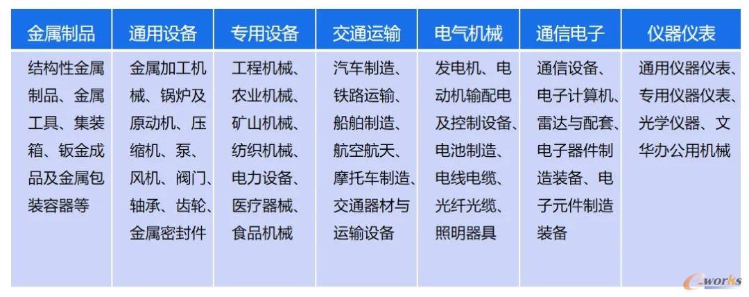 装备制造业不只生产装备,围绕装备上下游的产业也包含在内。主要包含金属制品业、通用设备制造业、专用设备制造业、交通运输设备制造业、电气机械及器材制造业、通信设备/计算机及其他电子设备制造业、仪器仪表及文化办公用机械制造业、金属制品/机械和设备修理业等: