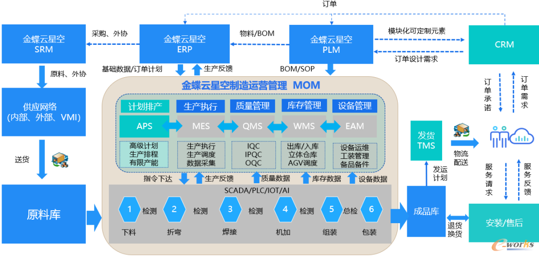 金蝶云·星空为装备制造行业提供可组装的制造运营管理能力(Manufacturing Operation Management,简称MOM),基于MOM能力,可为装备制造的研发管理、计划管理、生产管理、供应链管理、质量管理、设备管理、能耗管理、安装服务管理等业务提供全方位的数字化转型能力。南向链接生产设备、物料、人员等各种生产资源,北向支持企业的全面运营管理,支撑装备制造业向智能产品、智能制造和智能服务的商业模式创新。
