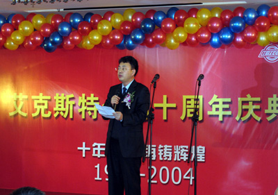 艾克斯特公司董事长龙大伟先生的致词拉开了庆典的序幕,他在致词中对长期以来各级领导、专家和合作伙伴对艾克斯特公司的帮助与扶持表示感谢,同时代表董事会对艾克斯特公司全体同仁十年来对公司的发展所做出的贡献表示感谢。艾克斯特公司总裁王学顺先生发表了十周年庆典的主题演讲,他指出:艾克斯特走过的十年,是中国制造业信息化产业起步发展的十年,也是艾克斯特逐步在国内制造业信息化领域取得领先的十年。面对全球软件产业结构调整和国内制造业的快速发展需求,艾克斯特将继续秉承“方案领先,客户至上,追求卓越,永无止境。”的企业宗旨,坚持自主开发与引进相结合,不断创新,以先进的一体化解决方案服务于制造业。未来十年,是中国软件产业充满机遇与挑战的十年,更是艾克斯特走向世界,铸就世界级品牌的十年。