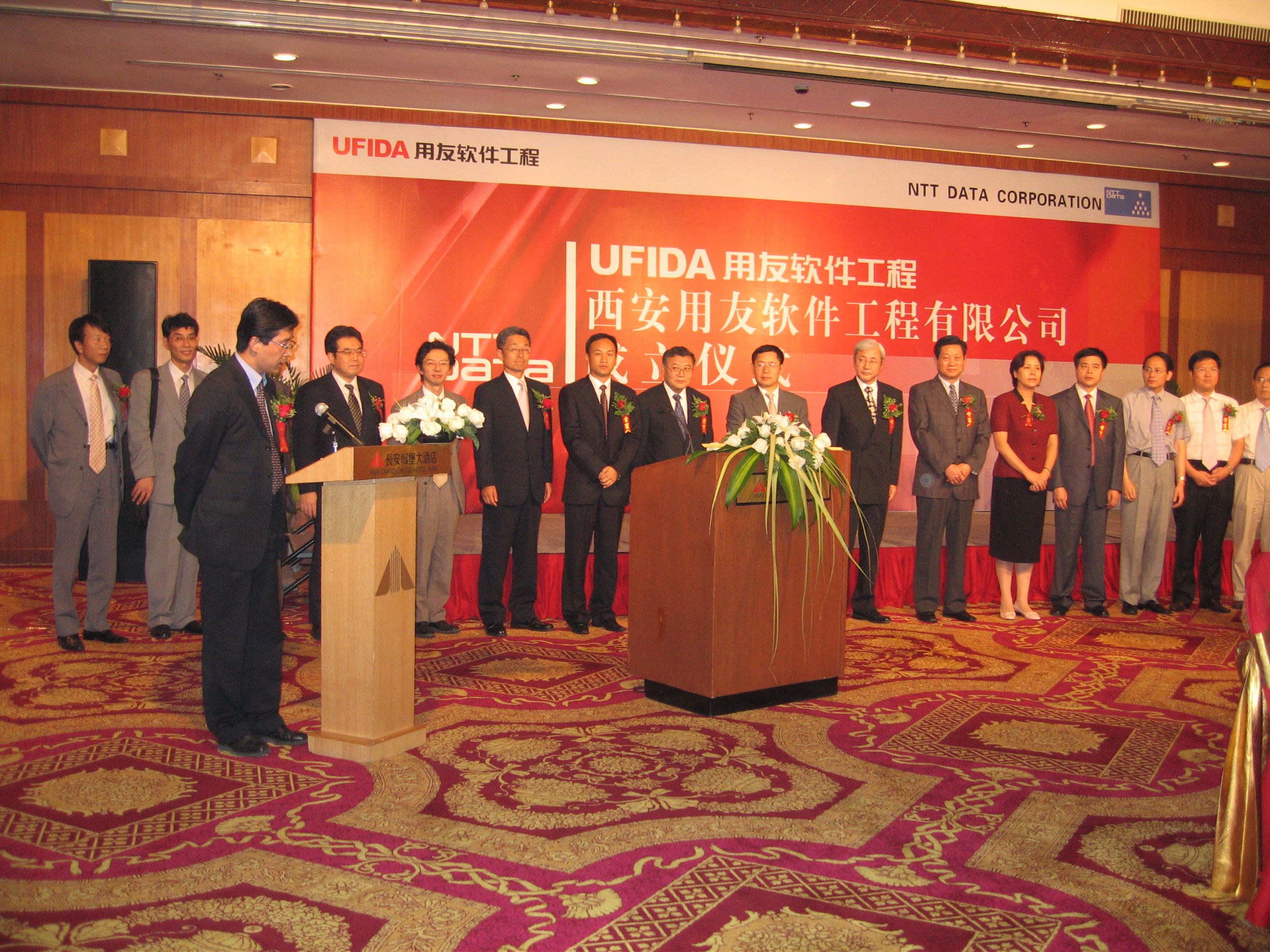 当年,“丝绸之路”将中国文明散播到世界,开辟出国际交流的通道。今天,沿着中华5000年的悠久历史遗迹,迈向国际化舞台的新丝绸之路——“数字丝路”又新增了一个生力军——用友软件工程有限公司与日本株式会社NTT DATA合资成立的西安用友软件工程有限公司正式落户西安软件园!2005年8月5日,来自陕西省人民政府、西安市人民政府、西安软件园的各级领导和日本株式会社NTT DATA、用友集团的高层管理人员以及各新闻媒体等近百人相聚在西安,共同参加了西安用友软件工程有限公司的成立大会。