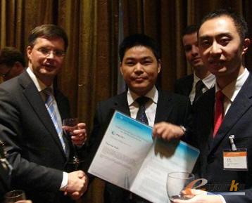 荷兰首相(左)与协达负责人(中)握手,商定协达软件出口欧盟协议
