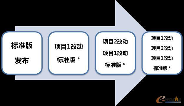 国内早期的版本管理多数使用Microsoft的Visual SourceSafe6.0简称VSS,使用这种管理方式多数是单线的管理方式,虽然VSS也提供一些分支与共享功能,但是它的性能低下,而且经常会出现问题,其可用性不高。其主要的版本管理模式如下图。