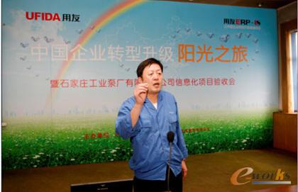 石家庄工业泵厂有限公司董事长兼总经理苏进先生首先代表石家庄工业泵厂讲话,他从整体上介绍了石家庄工业泵厂信息化项目,就如何借助信息化提升企业管理能力、如何选择企业信息化供应商等焦点问题介绍了自己的经验和体会,并对企业信息化畅谈了自己的见解,他的演讲赢得了与会人员的一致赞同。