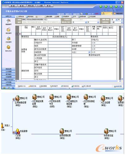 以中粮食品营销有限公司(为中粮集团旗下中国食品HK0506的全资子公司,负责“福临门”等系列厨房食品的营销推广)为例,其敏捷营销的概念在用友致远A6中得到了有效的体现,实现了刚柔相济的营销管控。在以前,中粮营销各城市区域经理发起促销申请,通过传真进行审批,往往要经过8、9个环节的层层上报,最后达到总部的传真件都模糊一片。更重要的是,整个流转时间长达10~15天,反应速度非常慢,难以对市场变化做到灵活应对。而现在,审批完成却2天时间都不到。右图为中粮营销一个典型的促销管理的表单模版及相应流程,其既能完成刚性的流程化审批(刚性管理),又能依据现实的情况在刚性流程的基础上进行“加签”“会签”“意见振荡”等柔性的调整(柔性管理),还可以根据审批的实际执行情况对流程做出调整和优化,进行流程再造,实现“刚柔相济”的有机结合。