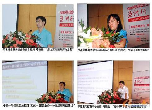 7月17日上午,以“应对危机、分享经验;服务升级,共度时艰”为主题的会议盛大召开,首先由用友GBU总经理助理兼运维服务业务总部总经理—李富强代表用友公司致欢迎词,并以“服务升级,共度时艰”为主题向与会用户及嘉宾介绍了用友高端服务解决方案—用友高端服务的四大升级策略(服务模式升级、服务产品升级、服务体系升级、高端服务“A•I”计划提速),让在座用户对用友高端服务更加充满信心,更加坚定与用友公司长期合作的决心;接下来由GBU运维服务业务总部服务产品经理—韩丽芳以“产品升级,应用领先”为主题,分享了NCV5.5产品新特性,为后续用户升级提供了重要的信息参考;在“应对危机,分享经验”环节里,由中建一局的信息部总经理—常戌一和大家作了“财务业务一体化信息系统建设”经验分享,由宁夏发电结算中心主任—马建勋分享了“基于ERP环境下的企业资金管理”,在座的用户及嘉宾都深感受益颇多;Oracle企业安全搜索美国总部首席产品专家—王晋宇以及高级业务发展经理刘凯共同介绍了“Oracle企业安全搜索与数据安全审计解决方案”;IBM创新中心架构师—罗顺和与会用户及嘉宾分享了“SOA/EAI 企业整合之道”;用友移动事业部高级业务经理—冯大鹏以互动的形式作了“MERP NC移动应用解决方案”,用友表单公司营销总监—李电波做了“集团客户信息化商用表单解决方案”介绍。与会用户及嘉宾纷纷表示通过这次活动,了解到了很多创新的理念和知识,以及用友公司强大的产品实力和服务保障!