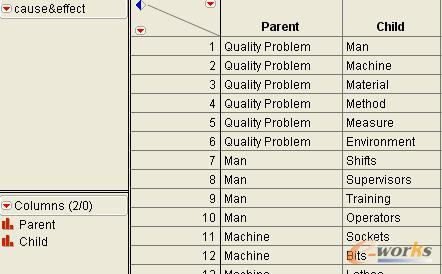 JMP有两种数据输入模式。第一种的数据格式如图一所示。总共有2列,分别为Parent父项和Child子项。这里的父项是指effect结果,子项是指cause原因,上一级的原因很可能成为下一级的结果,按上下层次结构逐行描述清楚,一共31行,正好等于所有大小鱼骨、鱼刺的总数量。第二种输入模式不需要事先在表格里输入数据,先作图就行,待图形完成后,可以将图形中的文字内容转换为表格。