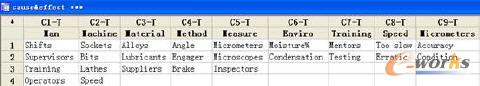 Minitab只有一种数据输入模式。它的数据格式如图二所示。总共有9列,分别为Man、Machine、Material、Method、Measure、Environment、Training、Speed、Micrometers,即构成整个鱼骨架的9个鱼骨分支,每列的行数等于它所对应的effect结果所包含的cause原因的数量。
