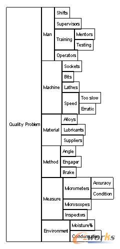 假设我们现在从人Man、机Machine、料Material、法Method、环Environment、测量Measure六个方面分析一个质量问题Quality Problem,我们分别用JMP和Minitab来制作一个鱼骨图看看……