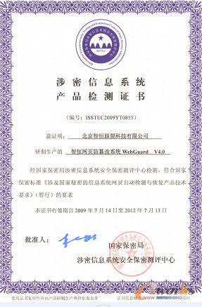日前,北京智恒联盟科技有限公司网页防篡改系统WebGuard V4.0产品,正式通过国家保密局涉密信息系统安全保密测评中心的产品认证,并获得了“涉密信息系统产品检测证书”。智恒联盟再次以雄厚的实力,印证了“成为Web安全领域最具影响力领跑企业”的承诺。