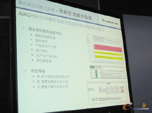 而在“克莱斯勒对其全球供应商的物流管理要求及介绍”中,克莱斯勒东北亚物流经理张雪冰女士介绍说:“我们想了解一个非常有竞争能力的供应商他的物流能力怎么样,就会用一个工具让供应商做一个自己供应链方面的评估。”同时张女士还建议在场的零部件厂商:不管是不是克莱斯勒的供应商,都可以应用这个工具,这就是AIAG的物料管理操作指南。零部件厂商可以运用这套自我审核的标准,衡量一下企业的水平到底高还是低,跟国际的差距有多远。