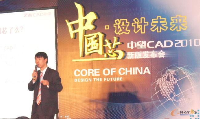 广州中望龙腾软件股份有限公司副总经理刘玉峰先生致开幕词并发表了《中国芯·设计未来》主题演讲,刘总从回顾中望推出第一款CAD开始,盘点了从中望CAD2001到中望CAD2010十年间的发展历程。刘总提到:实现国产CAD的振兴,要从四个方面努力:专注CAD核心技术、通过国产CAD联盟实现共赢、国产CAD走向世界、和用户一起打造国产CAD。刘总还表示:在做强中望二维CAD的基础上,中望在未来会进入到3D CAD和PLM领域。