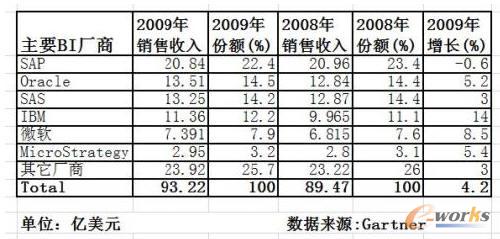 根据4月22日Gartner公司公布的数据显示,2009年全球商业智能和绩效管理市场超过93亿美元,比2008年增长4%。SAP、Oracle、SAS、IBM和微软这五大商业智能厂商占全球份额的70%。其中,SAP虽然同比下滑了0.6%,但依然以20.8亿美元的销售收入和23.4%的全球份额领跑BI市场。排名第二的Oracle公司BI销售额为13.5亿美元,增长5.2%;SAS公司以13.2亿美元排名第三;IBM公司以11.4亿美元排在第四,但14%的增速在所有大公司中是最快的。微软以7.4亿美元排名第五,增长8.5%。