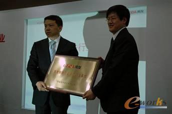 用友软件高级副总裁章培林(右)为用友软件河北省区总经理左俊授牌