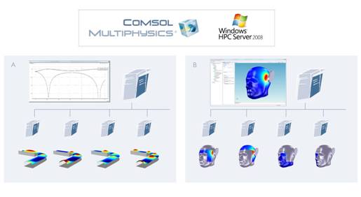 Windows HPC Server 2008系统上的多物理场仿真。可以利用将参数步骤分散到不同的物理节点上,求解同一个参数化问题(左侧)。也可以将一个独立的问题分散到不同节点上求解不同部分(右侧)。