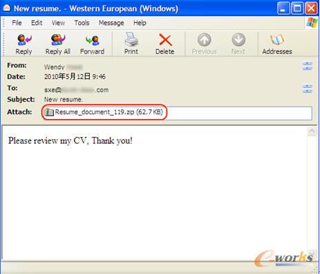 Websense发布紧急警告,希望各企业人力资源部门员工小心处理来历不明的简历邮件,错误举措可能最终危及企业的重要数据安全。2010年5月12日,Websense安全实验室研究人员最新发现一批以求职为幌子的恶意垃圾邮件爆发。这些垃圾邮件的目的是针对组织人力资源部门以及他们的电脑,邮件中的内容是请求接收者查阅邮件附件中简历,但并没有说明其申请的职位,此外,部分附件还被伪装成照片等格式以方便能够进一步降低接收者的防御并促使他们点开附件。就在当前上午,Websense观察到在4个小时内已有230,000份类似的垃圾邮件被散播出去,而且这个数字还在迅速增长中。