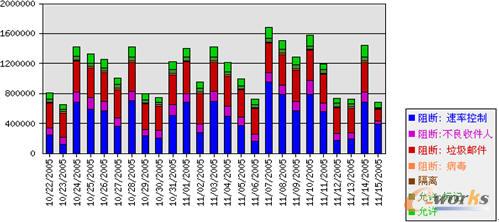 正如上图统计的数据,广州电信作为广州大型邮件服务商之一,经常成为垃圾邮件发送者的目标,如广州电信85%的邮件均为非正常邮件(不良收件人的邮件,目的不明的邮件,携带病毒和恶意程序的邮件,字典攻击邮件等等),梭子鱼垃圾邮件防火墙每日生成这类列表,方便管理员汇总报告。
