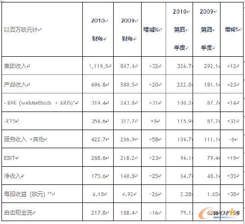 税前利润在集团层面增长了19%,达到9.41亿欧元,主要由于在高利润产品的份额在总销售中的增加,与IDS Scheer 公司合并后的成本协同效益,和在第四季度货币汇率的持续积极影响。这些因素也促成了纯收入和每股盈利增长36%,再次达到历史峰值。 2010年全年收入增长25%,超过了最终预测的19%-20%。这些指标在整个2010年已经被提升了若干次。