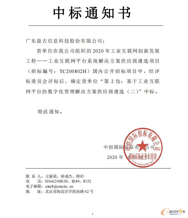 广东盘古信息科技股份有限公司,在2020年工业互联网创新发展工程—工业互联网平台系统解决方案供应商遴选项目(招标编号TC 200802H)国内公开招标项目中,经评标委员会评标后,中标“第2包:基于工业互联网平台的数字化管理解决方案供应商遴选(二)”项目。