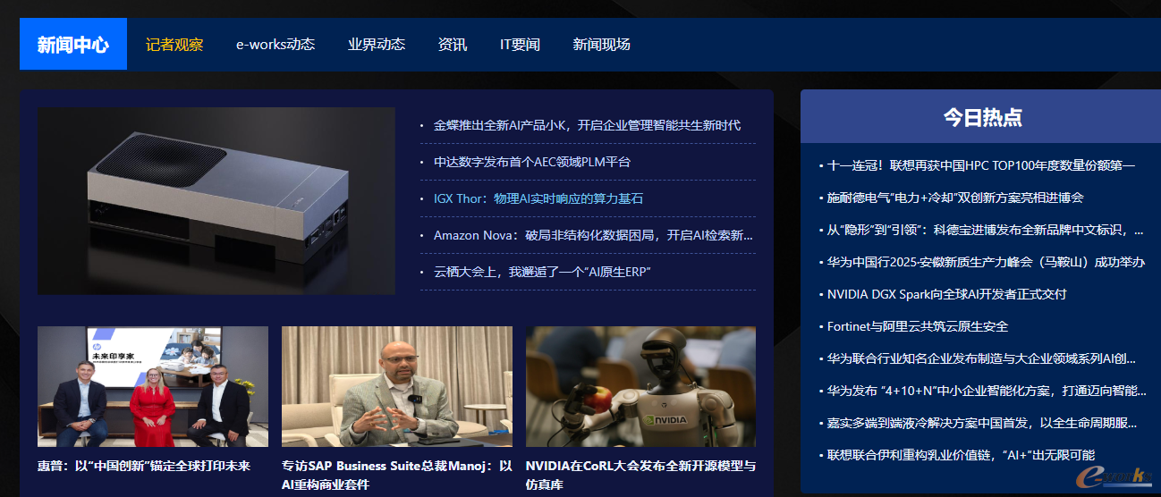 新闻板块:整合业界动态、资讯、IT要闻与e-works记者观察等内容,新增今日热点栏目,全天更新数字化领域重大事件,实现由点及面的信息延伸。