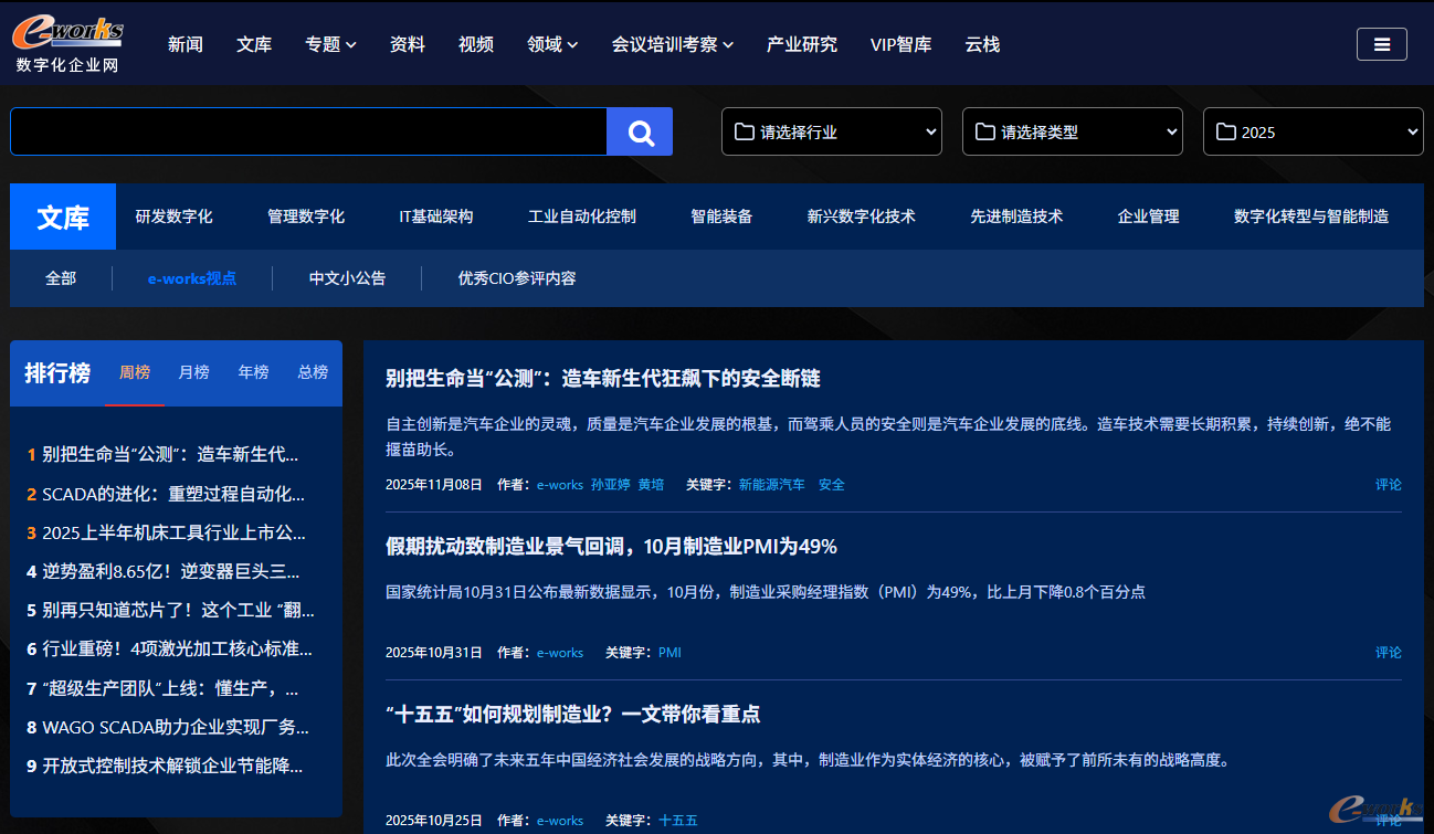 智库板块:升级资料频道与视频栏目,资料库涵盖智能研发、智能工厂、智能管理、智能物流与供应链、智能服务等数字化多个领域干货文档;视频栏目聚合行业大会直播报道、专家在线讲坛、e-works现场访谈、业界前沿观察等内容,专业知识一网打尽。