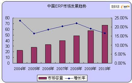 e-works预计,2006年中国制造业ERP的市场将达到32.6亿元,增幅17.1%。据e-works预测,未来五年中国制造业ERP的市场复合增长率将达到19.4%,到2010年,中国制造业ERP营业额将达到67亿元,在全球ERP市场份额将超过2.4%。