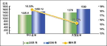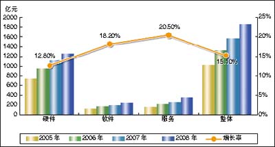 中国电子信息产业发展研究院党委书记、副院长李颖则通过报告的形式,用一组数据来概括这个快速成长的市场:2006年,中小企业IT投资整体规模比2005年增长18.3%,达到1450亿元左右。预计2008年投资规模达到2014亿元左右,未来规模将达到5000亿元,2005至2008年复合增长率将达到15.1%。