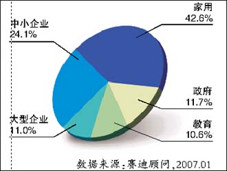 会议进行到中程,联想集团副总裁夏立作为厂商代表上台讲话。夏立用了“非常高兴也非常兴奋”来形容自己的心情。身为联想中小企业业务板块领军人的他,没理由不高兴——在2006年国内中小企业的PC市场上,联想扬天销量突破130万台,占到35%的市场份额。而这一切看起来似乎顺理成章:中国最大的PC企业,最先进入中小企业市场,成为又一个细分市场的领先者。
