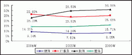 未来三年汽车行业的IT市场规模将保持持续稳定的增长态势,到2006年市场规模将达51.47亿元。从增长速度来看,汽车行业硬件规模增长速度趋缓,软件与服务增速上升,尤其是软件,到2006年增长率将达到31%;从产品比例来看,硬件产品的比例在逐渐下降,软件与服务的比例相应上升。从而反映出汽车行业信息化建设水平将逐步提升,实现从“硬件为主”向“软件服务为主”的良性转变。