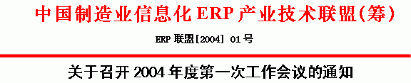 为了在回顾和总结ERP产业技术联盟前期工作的基础上探讨ERP产业技术联盟下一步的工作思路和主要工作任务。兹定于2004年6月22日下午14:00-17:00在北京友谊宾馆召开“中国制造业信息化ERP产业技术联盟2004年度第一次工作会议”现将有关事项通知如下: