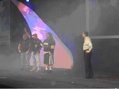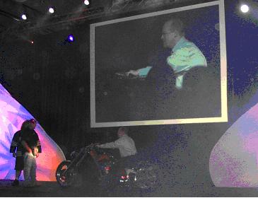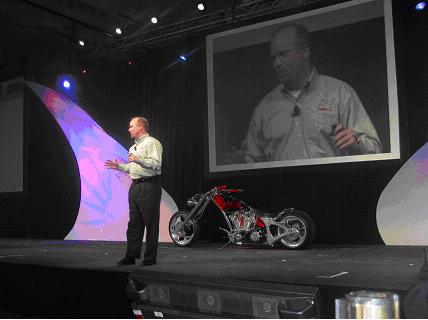 Jeff将Orange County Choppers摩托车店的主人Paul Teutul, Sr和他的两个儿子请到了现场,请他们介绍使用SolidWorks的感受。在问到老Paul的使用感受时,他幽默地说,分析产品性能很简单,“Blue is good, red is bad.”聊聊数语,道出COSMOS软件简便的操作和优异的功能,赢得观众的喝彩。