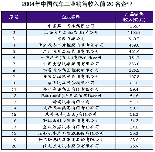 在日前召开的《2005年机械制造业发展论坛》上,中国机械工业联合会公布了2004年中国机械工业销售收入前100名、汽车工业前30名企业信息发布报告。位于汽车工业产品销售收入前三位的是中国第一汽车集团、上海汽车工业(集团)总公司和东风汽车公司。