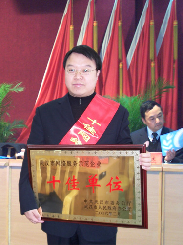 本网讯 10日上午,武汉市委、市政府在江汉区政府会议室召开了"全市信息化工作会议"。会上表彰了2005年武汉市十佳政务信息化应用系统、十佳政务网站、十佳网络服务示范企业。e-works获得了"十佳网络服务示范企业"称号。