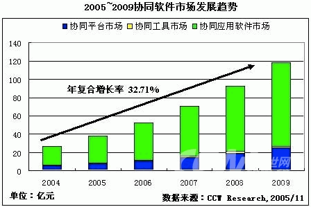 在未来五年内,协同软件整体市场将以年复合增长率32.71%的速度增长,到2009年,整体市场将超过100亿元,达到118.5亿元。在整体市场中,增长速度最快的是协同平台软件市场,年复合增长率将达到34.03%。