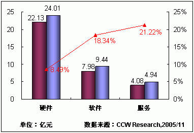 计世资讯(CCW Research)数据显示:在电子行业2005年的IT投入中,其中硬件规模为24.01亿元,占62.53%;软件为9.44亿元,占24.59%;服务为4.94亿元,占12.88%。电子行业信息化硬件投入依然处于绝对地位,电子行业信息化系统方面投资最多的是财务软件、OA系统和ERP,投资规模分别为6.30亿元、5.60亿元和5.30亿元。投资最少的是安全系统,规模为0.76亿元。