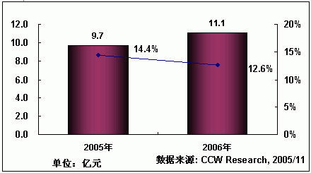 由于2006年制药行业信息化将以消化现有资源为主,所以2006年制药行业企业信息化投入继续放缓。计世资讯(CCW Research)预测:2006年制药行业IT投资总规模预计为11.1亿元,比2005年同比增长12.6%,增长速度相比2005年下降了1.8个百分点。这主要是由于前两年GMP认证促使制药企业集中投资,而2006年部分企业在大规模投入之后进入暂时性消化调整所致。