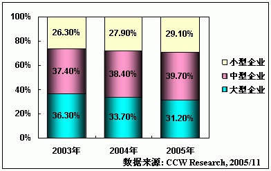 由于近年来机械行业供需两旺,经济效益良好,机械行业信息化建设也逐渐开始提速, 2005年机械行业在信息化投资上,大、中、小型企业的投资所占比重变化区间不是很大,主要原因在于我们国家的机械工业企业数量众多,而且企业规模分布比较平均,集中度不高。2005年大型企业投资占行业信息化总体投入的31.20%,中型企业投资增长略快,占总投入的39.70%,而数量庞大的小型企业占行业总投入的29.10%。