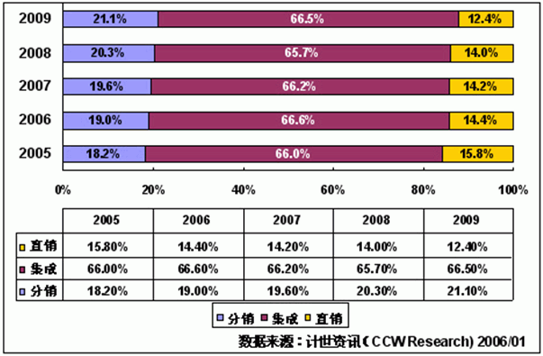 随着中国网络市场的逐渐发展,厂商与渠道的分工越来越明确,厂商直接进行客户销售的案例将越来越少。因此,计世资讯(CCW Research)认为2006至2009年,中国路由器渠道市场结构中直销方式所占比例将越来越少,到2009年,将从2005年的15.8%下降至12.4%。