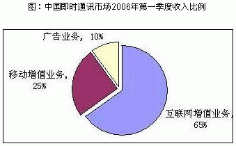 从赢利模式看,中国即时通讯市场的赢利模式仍以互联网增值业务、移动增值业务和广告业务为主。2006年第一季度互联网增值业务收入有所增加,占整个即时通讯收入的65%左右;但是,随着电信运营商控制力度的加大,移动增值业务的收入比重有较明显的缩小,从2005年第一季度的将近50%减小到目前25%左右;广告业务收入稳步上升,目前占总收入的10%左右。