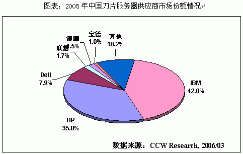 2005年,在中国刀片服务器市场上, IBM、HP是市场中主要的产品供应商。从销售额上看,根据计世资讯(CCW Research)相关市场报告数据显示:2005年,IBM、HP在刀片服务器市场占据了主要地位,占总市场的85.3%。其中HP市场占有率达到了43.3%,IBM市场占有率为42.0%。