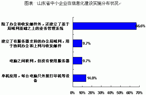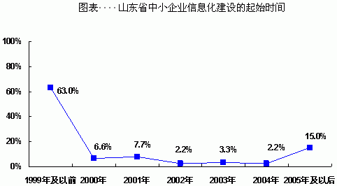 从整体来看,山东省中小企业的信息化建设水平在全国范围内处于中等位置。超过60%的山东省中小企业进行信息化建设的起始时间都在1999年之前,2003年和2004年才开始搞信息化建设的中小企业比较少。在信息化建设的内容上,大部分中小企业用户都建立了局域网络,实现了网络化办公和上网收发电子邮件。而且很多中小企业在网络应用的基础上,使用了业务管理系统。