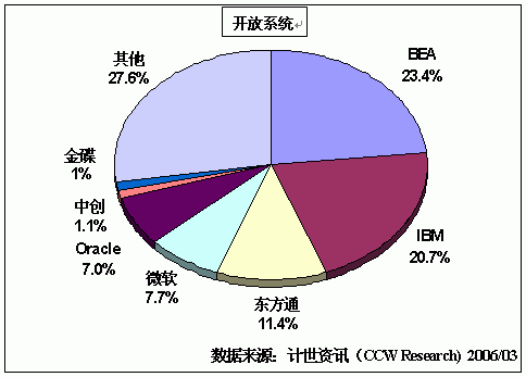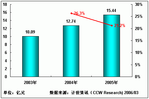 根据计世资讯(CCW Research)的数据显示,2005年中国中间件软件产品市场销售额达到15.44亿元,而2004年其市场销售额为12.74亿元,同比增长21.2%,比上一年26.3%的增长幅度有所下降。研究显示,开放系统市场的销售额已达14.94亿元,已在国内中间件市场中占据主要位置。