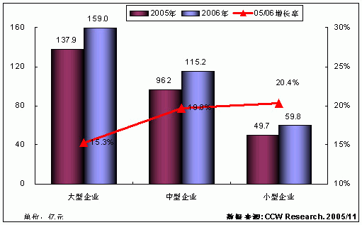 2006年中型企业的信息化投入依然保持高速追赶的态势,增长率为19.8%,市场规模预计将达到115.2亿元。从应用的阶段分析,目前中型企业多处于系统建设的阶段。但由于中型企业由于有对大型企业信息化的借鉴和学习,其应用避免了很多试验性的重复建设。因此计世资讯(CCW Research)认为:在2006-2007年之间中型企业的信息化会逐步地从信息系统建设阶段向信息系统整合阶段过渡,对专业服务的需求也会大幅地提升。