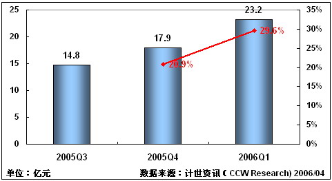 计世资讯(CCW Research)数据显示,2006年第一季度中国网络游戏市场规模达到23.2亿元人民币(含渠道收入),比上一季度增长29.6%。值得注意的是,进入2006年,休闲游戏开始飞速发展。在第一季度,有大批休闲游戏开始进行推广,包括大宇公司的《阿猫阿狗OL》、盛大网络的《疯狂赛车》、世纪天成的《跑跑卡丁车》、以及腾讯代理的《QQ音速》等。休闲游戏已经成为第一季度网络游戏市场增长的生力军。