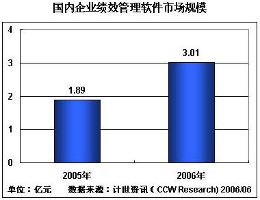 据国内权威IT市场研究机构,计世资讯(CCW Research)最新的公布数据显示,2005年,国内企业绩效管理软件(BPM/CPM)市场规模为1.89亿元人民币,到2006年底,预测其市场规模将突破3亿元人民币,市场增长率将达到59%,增幅显著。
