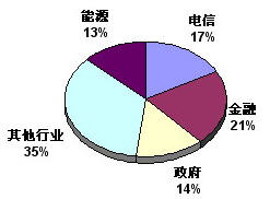从出货量来看,在行业市场中金融,电信,政府处主导地位,主要的行业用户市场共占据了52.0%的市场份额。其中金融占 21%,电信占17%,政府占14%,能源占13%,其他占35%。