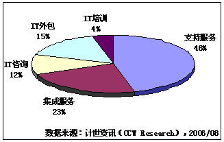 计世资讯(CCW Research)最新数据显示,2006年第二季度,中国IT服务市场规模达到121.5亿元人民币,比上季度增长22%。其中支持服务55.7亿元人民币,专业服务65.8亿元人民币。专业服务中,集成服务(不包括定制软件开发)、IT外包和IT咨询服务,分别为27.9、18.8和14亿元人民币。第二季度,IT外包市场有很大突破,千万级的大单频繁出现,国内大型IT服务厂商开始发力。其中IT外包服务包括以长期合同形式维修维护外包服务、IT系统外包和应用服务外包。在行业分布上,政府和金融行业由于数据大集中等,给项目带来IT服务的增长。