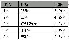 第二季度,IBM和HP分列IT服务前两位厂商,由于支持服务上的收入,IBM和HP在IT服务总数上远远领先于国内厂商。集成服务,作为国内厂商的传统优势项目,前五名厂商市场份额相差不大。但除了在集成服务上保持平稳增长以外,IT外包越来越受到国内厂商的关注,通过行业优势实现IT外包上的突破,并在第二季度初显成果。整个IT服务市场中,前五名厂商市场份额不足15%。