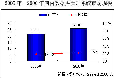 根据计世资讯(CCW Research)研究数据显示,2005年中国数据库管理系统市场销售规模为21.3亿元人民币,市场增长率为18.1%,国内数据库市场继续保持平稳的增长。2006年,预测国内数据库管理系统市场规模将达到25.88亿元人民币,增长率达到21.5%,增幅会比2005年略有提高。总体而言,国内数据库市场相对其他基础软件产品,市场波动不大,处于稳步攀升的状态。