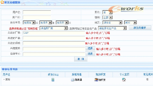 3、依据选项(照片、性别、地区、信息化产品、兴趣爱好,等等)选择您的信息化友人,见下图: